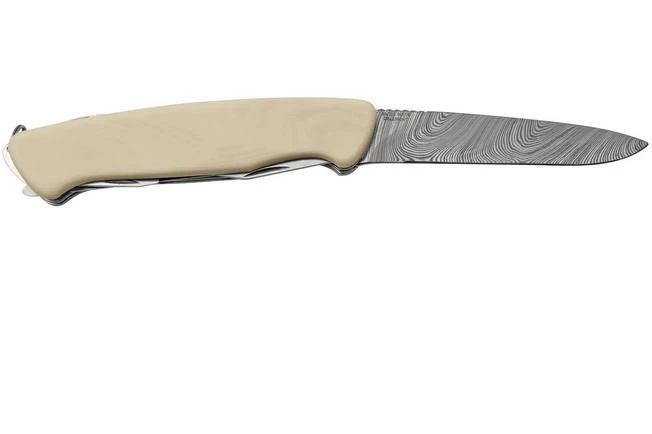 The Victorinox Ranger 55 Micarta Damask is the 2023 Limited Edition of the large and luxurious Swiss pocket knife, the Ranger 55. Only 7000 pieces of this limited edition knife were produced. This larger size offers a great handle, making this knife very pleasant to work with. The longer blade works perfectly when cutting cheese into little blocks. The beautiful ivory micarta scales make it look very luxurious.