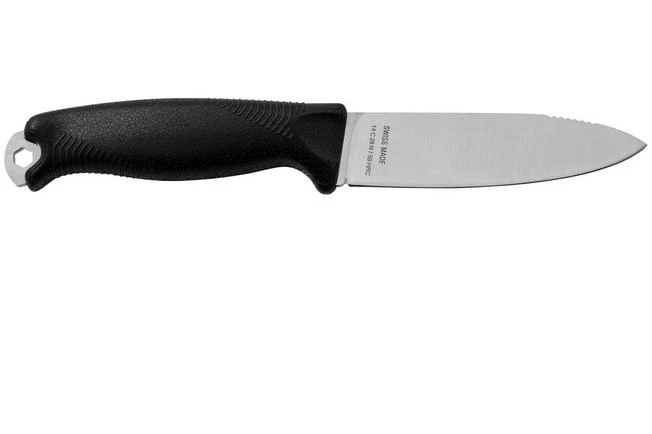 The Victorinox Venture Black is a bushcraft knife with a fixed blade. Developed by outdoor experts, this reliable piece of specialist gear makes light work of any challenge. The Venture has a drop point blade for precise cutting, a sharp 90° spine for a fire steel and a sheath that also acts as a blowpipe to quickly light the fire.